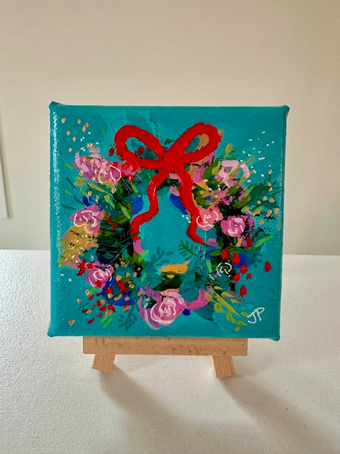 "Christmas Wreath 11"- 4x4x.5 Acrylic Original on Canvas with easel