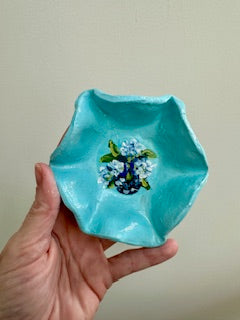This is a one of a kind, made entirely by hand clay trinket dish. It features our hand painted signature hydrangeas. This is not food or dishwasher safe. It measures about 4.5in wide and 1.5in tall.