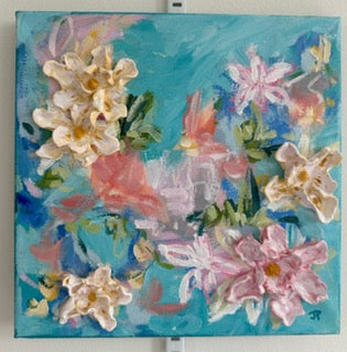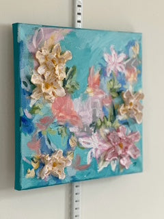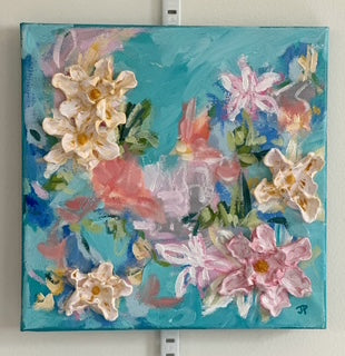 This painting is a one-of-a-kind original painting on a 10x10x.5 canvas. It features mixed media elements or clay flowers for extra depth and dimension