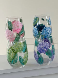 Each stemless wine glass is hand painted with my signature hydrangeas. Each one will vary slightly as they are all hand painted. These are dishwasher safe on the top rack but for best results we recommend hand washing.