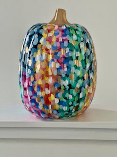 This is a hand painted foam pumpkin. It measures 13in tall.