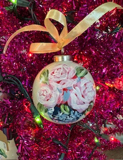 This ceramic ornament measures about 3" Dia. x 3" H. It is hand painted with acrylic paint and a glossy finish. It features a yellow rose bouquet on one side and a pink rose bouquet on the other. Each ornament is hand painted so they are all slightly different