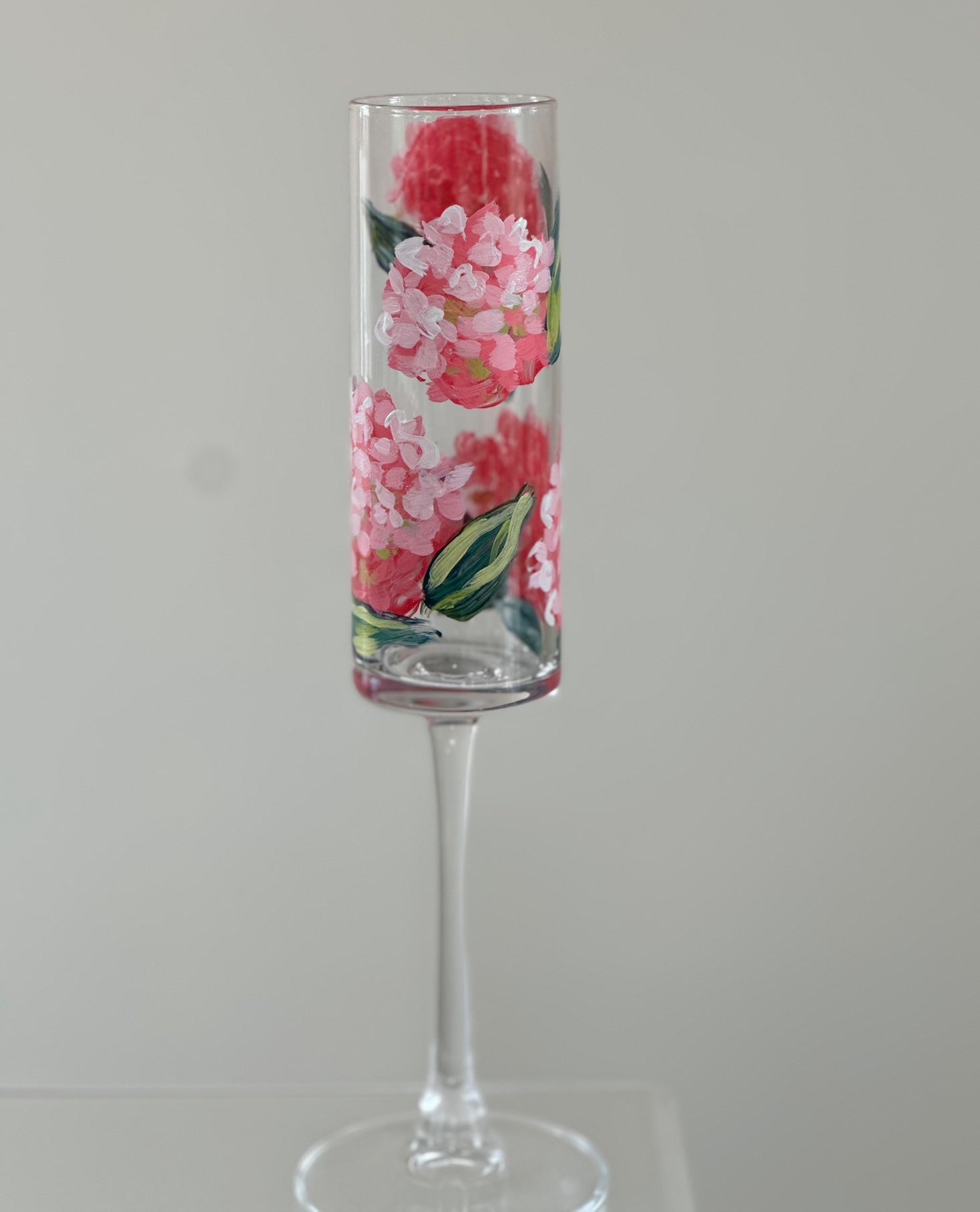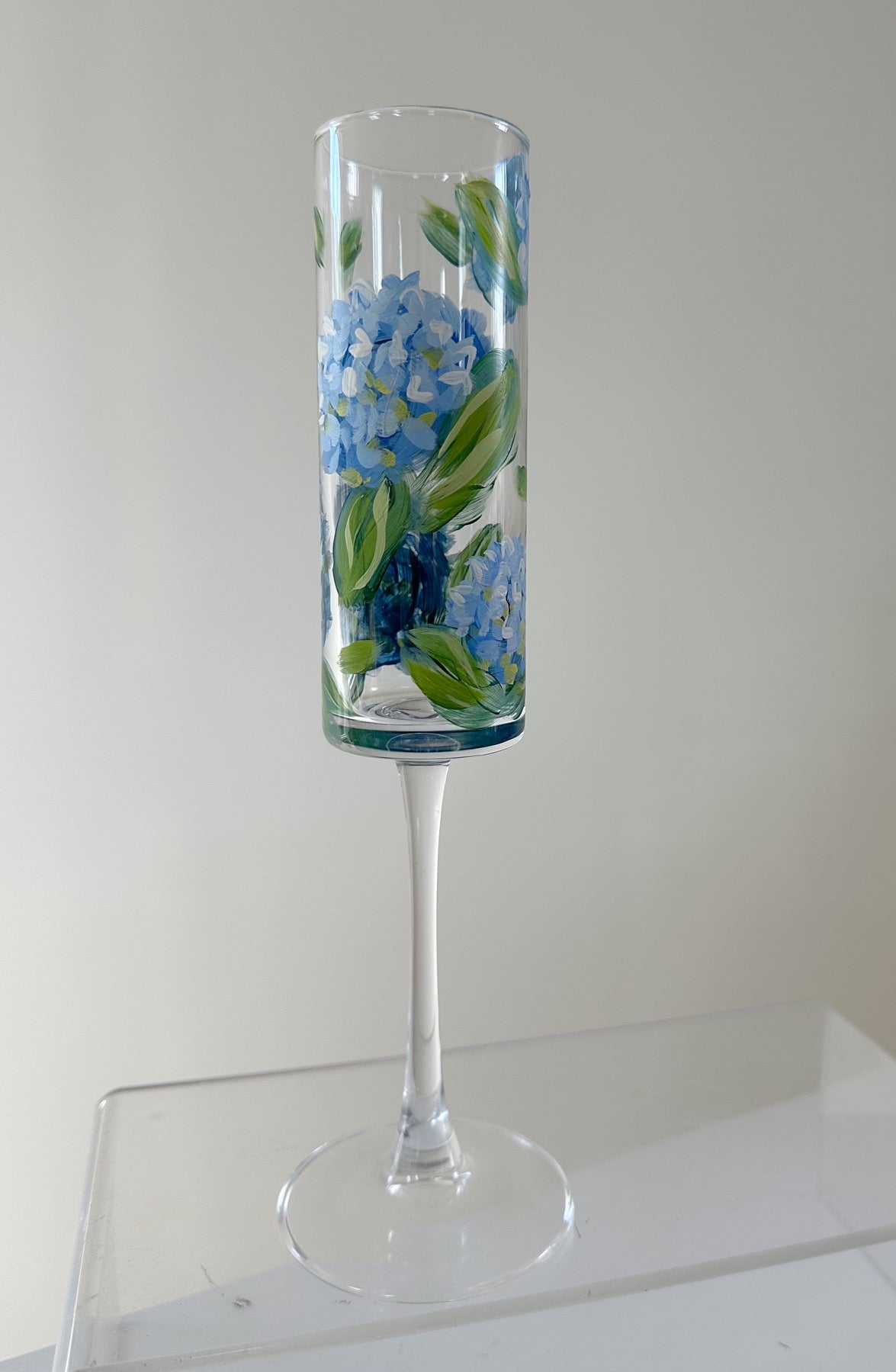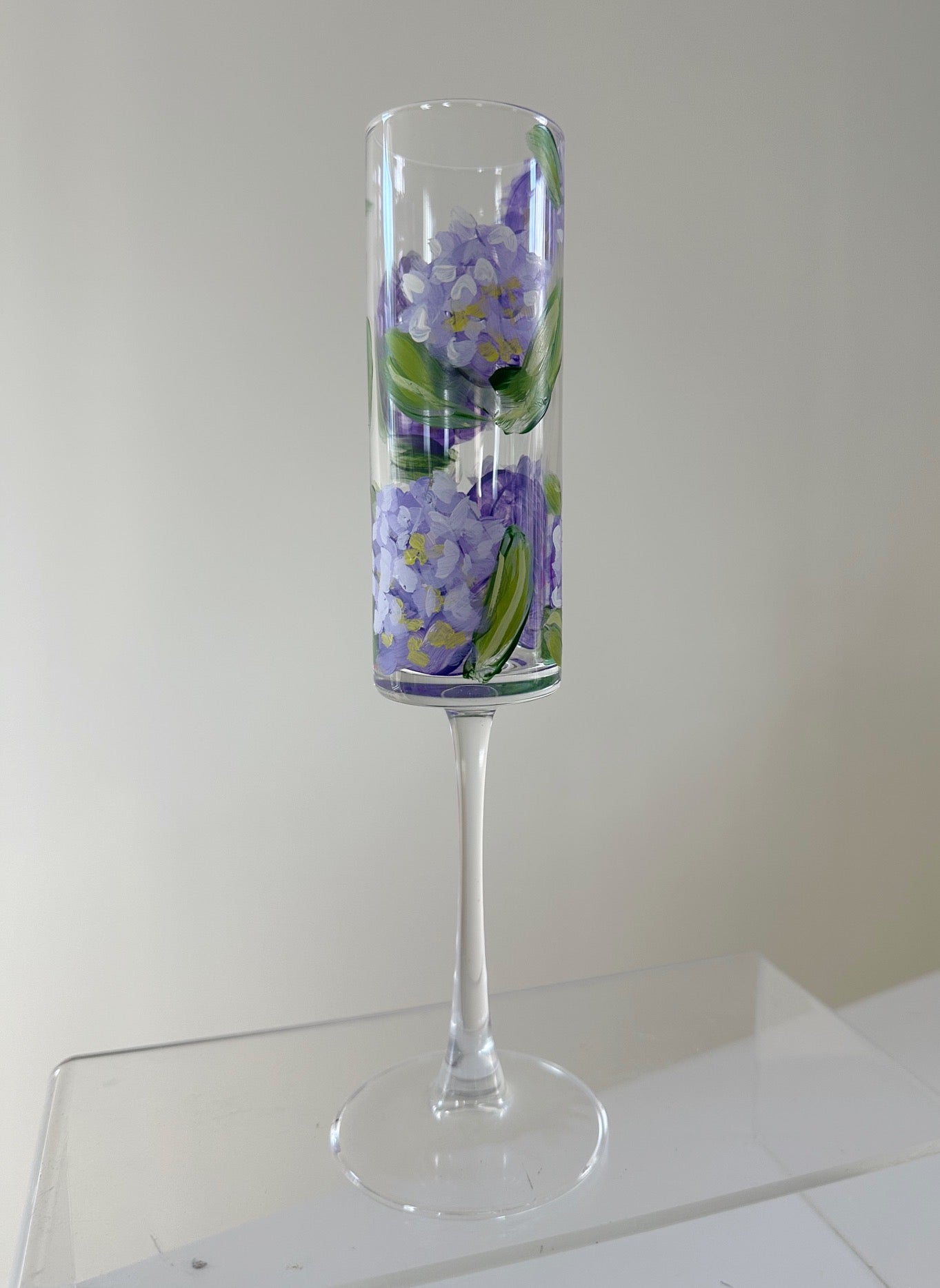 Each glass champagne flute is hand painted with my signature hydrangeas. Each flute will vary slightly as they are all hand painted. These are dishwasher safe on the top rack but for best results we recommend hand washing.
