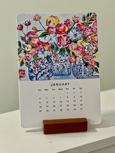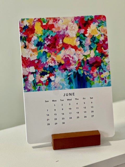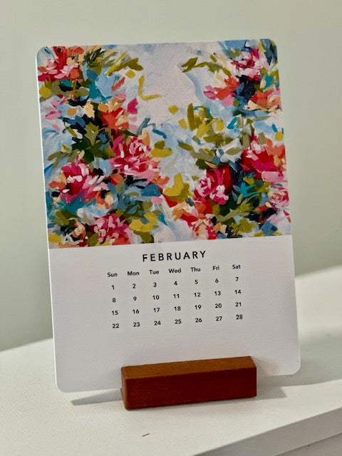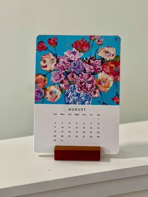 A new vibrant floral painting to celebrate every month! This is a desk calendar with a wooden block to hold each sheet. It measures approximately 8.5in tall by 6in wide.